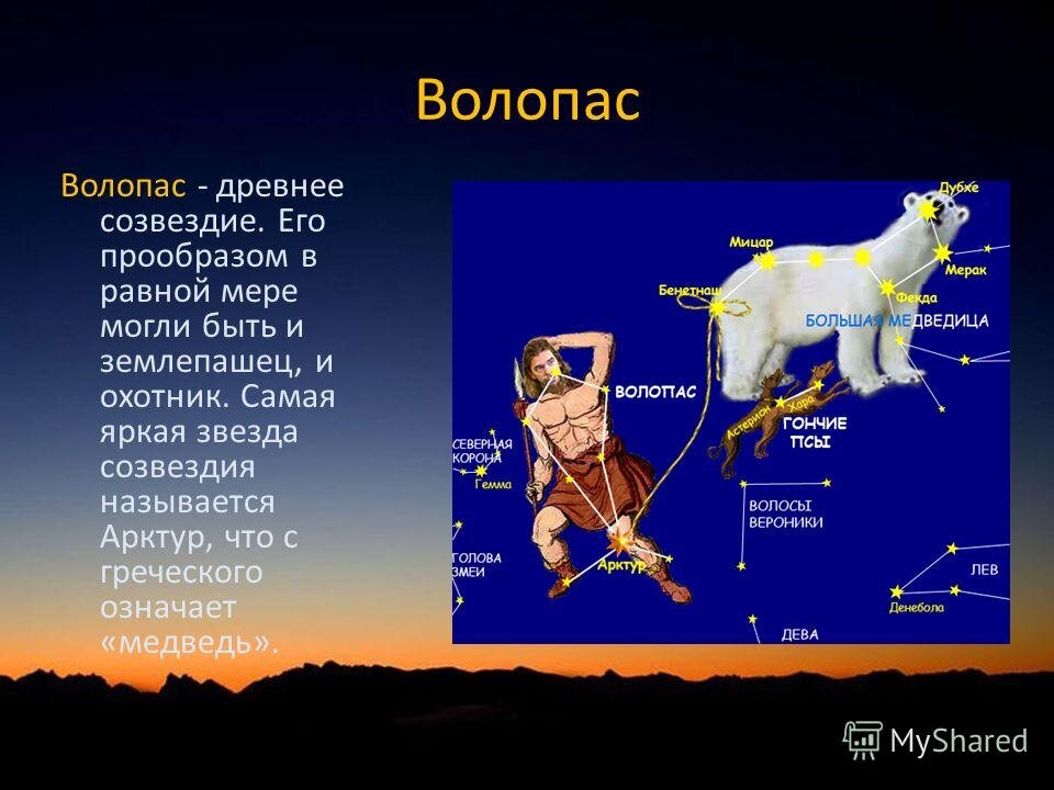 Волопас - созвездие северного полушария. Волопас- сельский пастух или охотник. В греческой мифологии это созвездие связывалось с Аркадом, сыном нимфы Каллисто, обращенной богиней Олимпа Герой в медведицу, которую Аркад чуть не убил. (Для справки: "Аркад - имя в честь греческой исторической области Аркадии - места, где всегда покой, счастье и царит простота нравов".) По Птолемею, звезды Волопаса действием подобны Меркурию и Сатурну, а звезда Арктур - Марсу и Юпитеру.