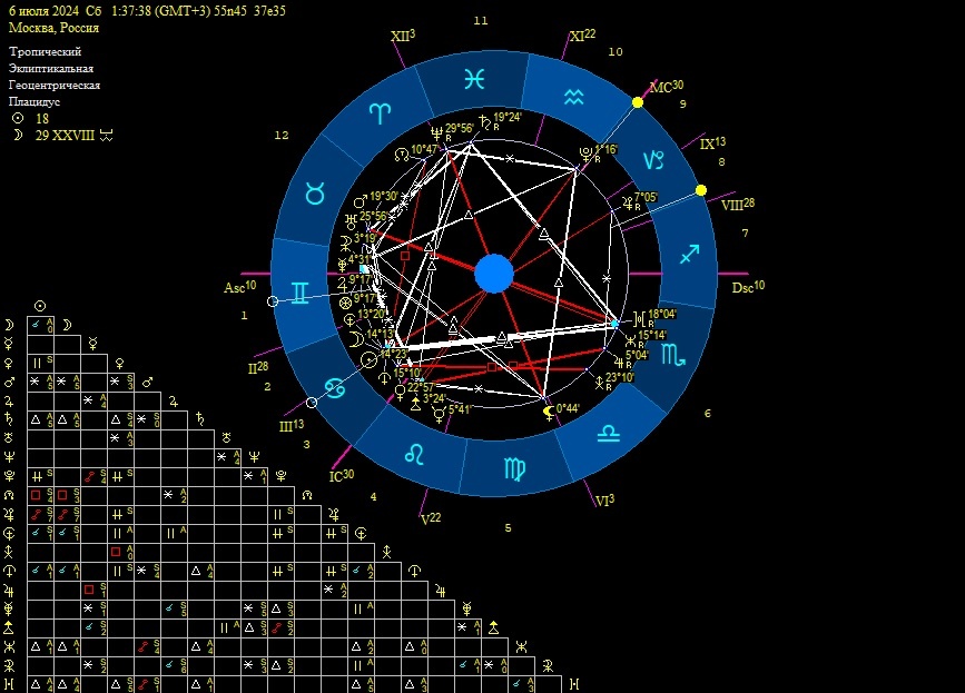 Есть также сходящаяся оппозиция Марса с Прозерпиной. Марс очень импульсивно и быстро хочет решать все проблемы, и эту импульсивность Прозерпина отмораживает. Нептун продолжает свою долгоиграющую оппозицию с Чёрной луной. И мне видится, что это касается вещей, которые далеки от нас и их жизнь нам непонятна. Это маленькие микробы, то есть, - это микробы в месте положения Прозерпины - в водном знаке Скорпиона, ретро Сатурн - в Рыбах, опять вода, Полнолуние в Раке.